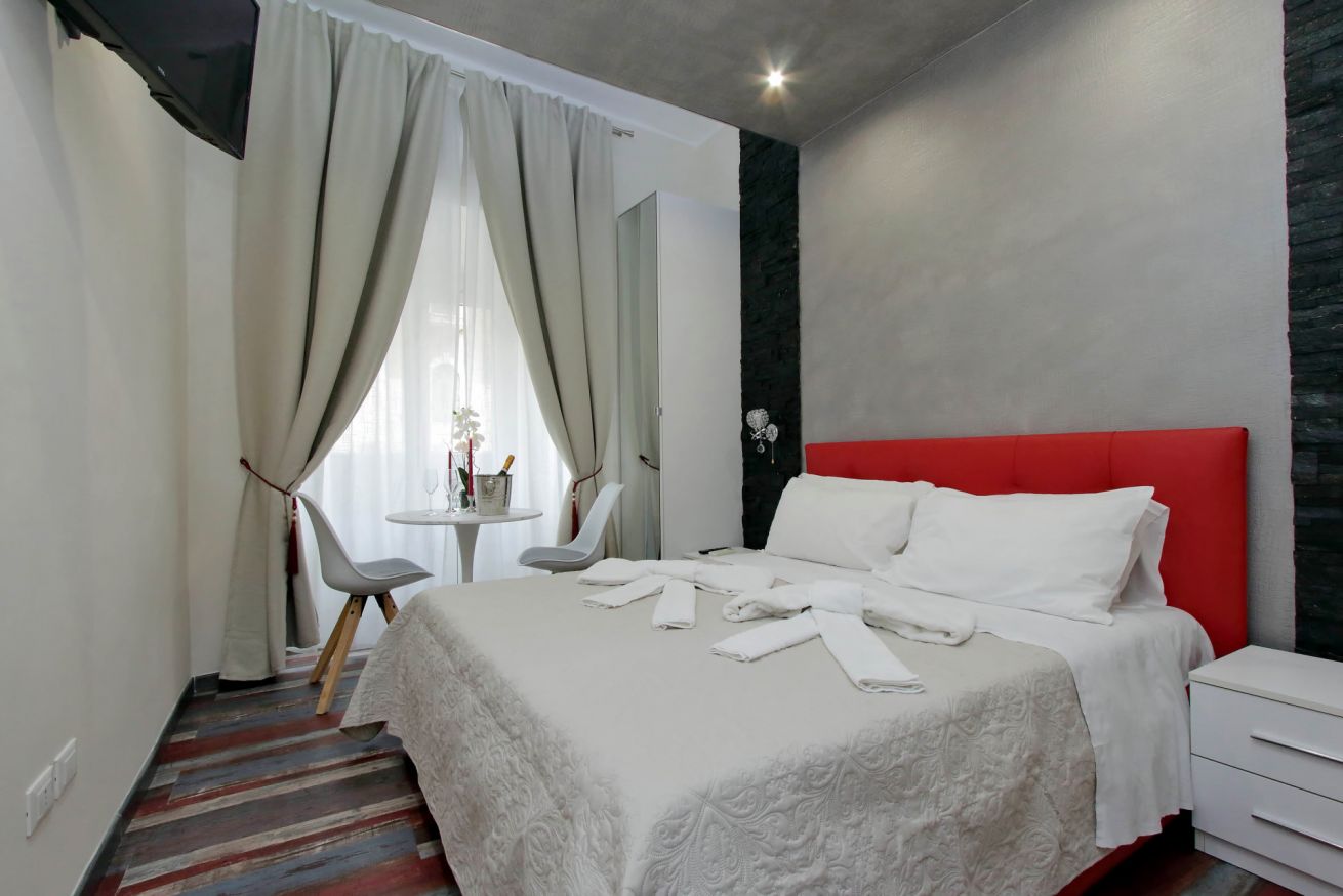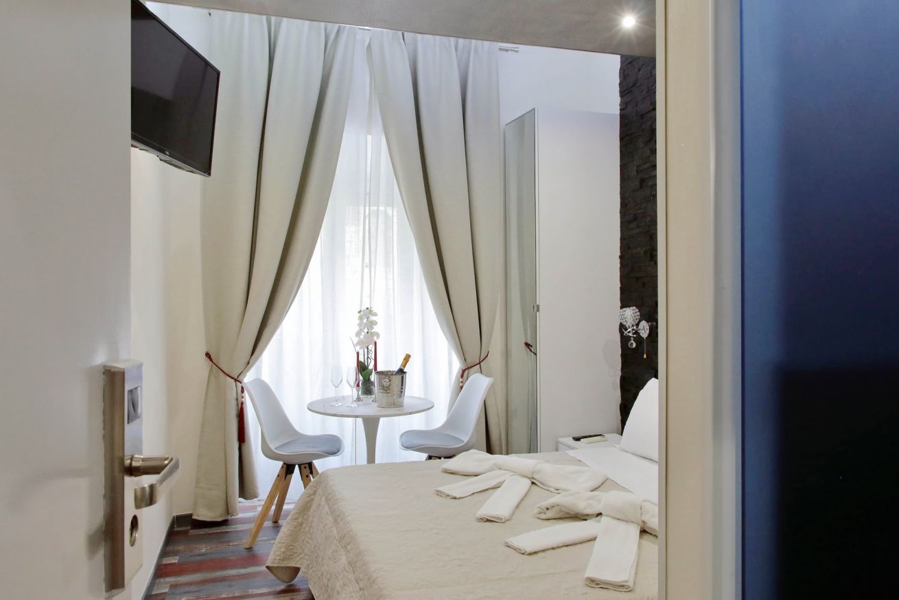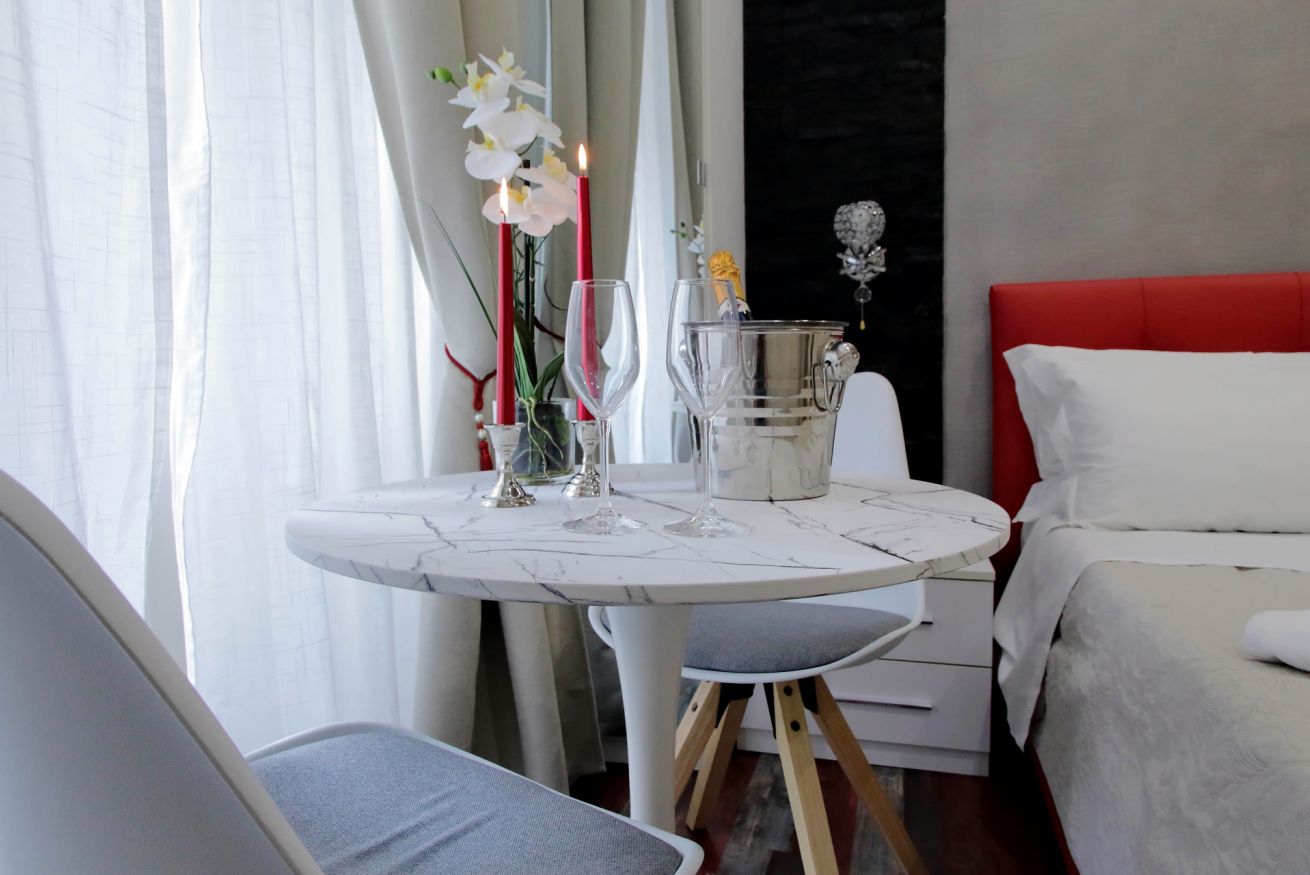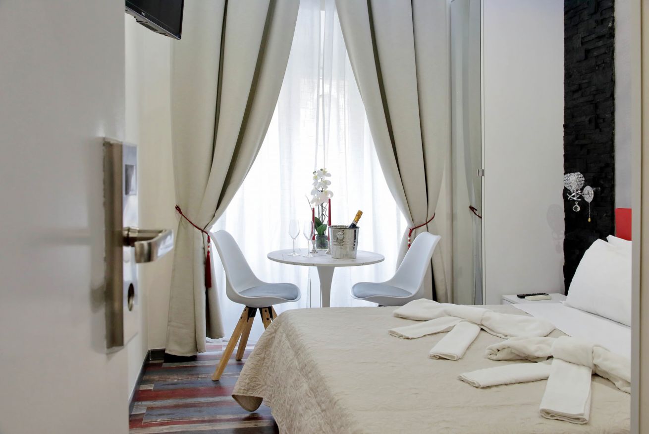 Piccola camera di 17 mq con letto alla francese, arredato con gusto e attenzione per i particolari, ideale per chi per lavoro, o per vacanza, si trovi da solo a visitare la città.
